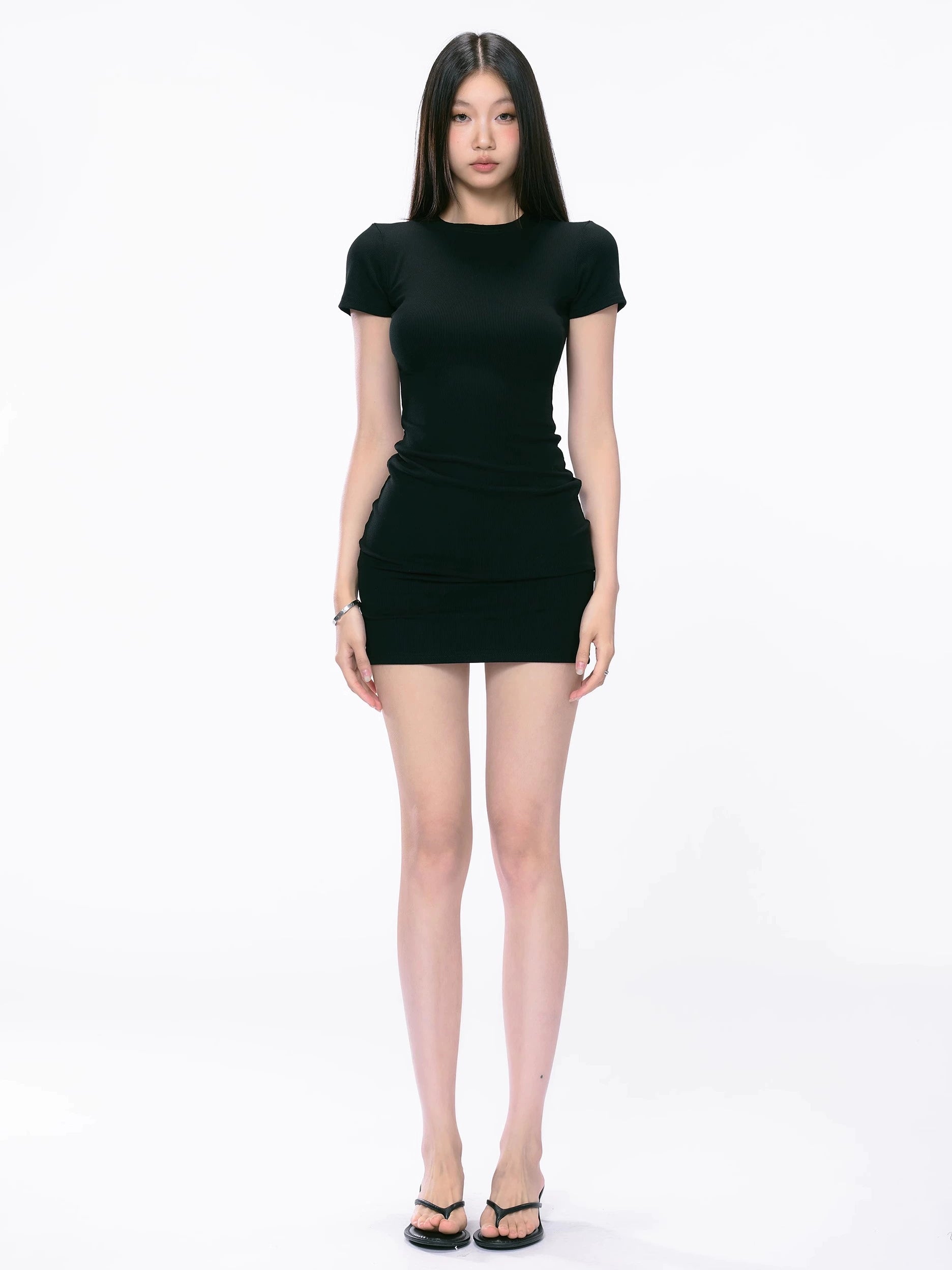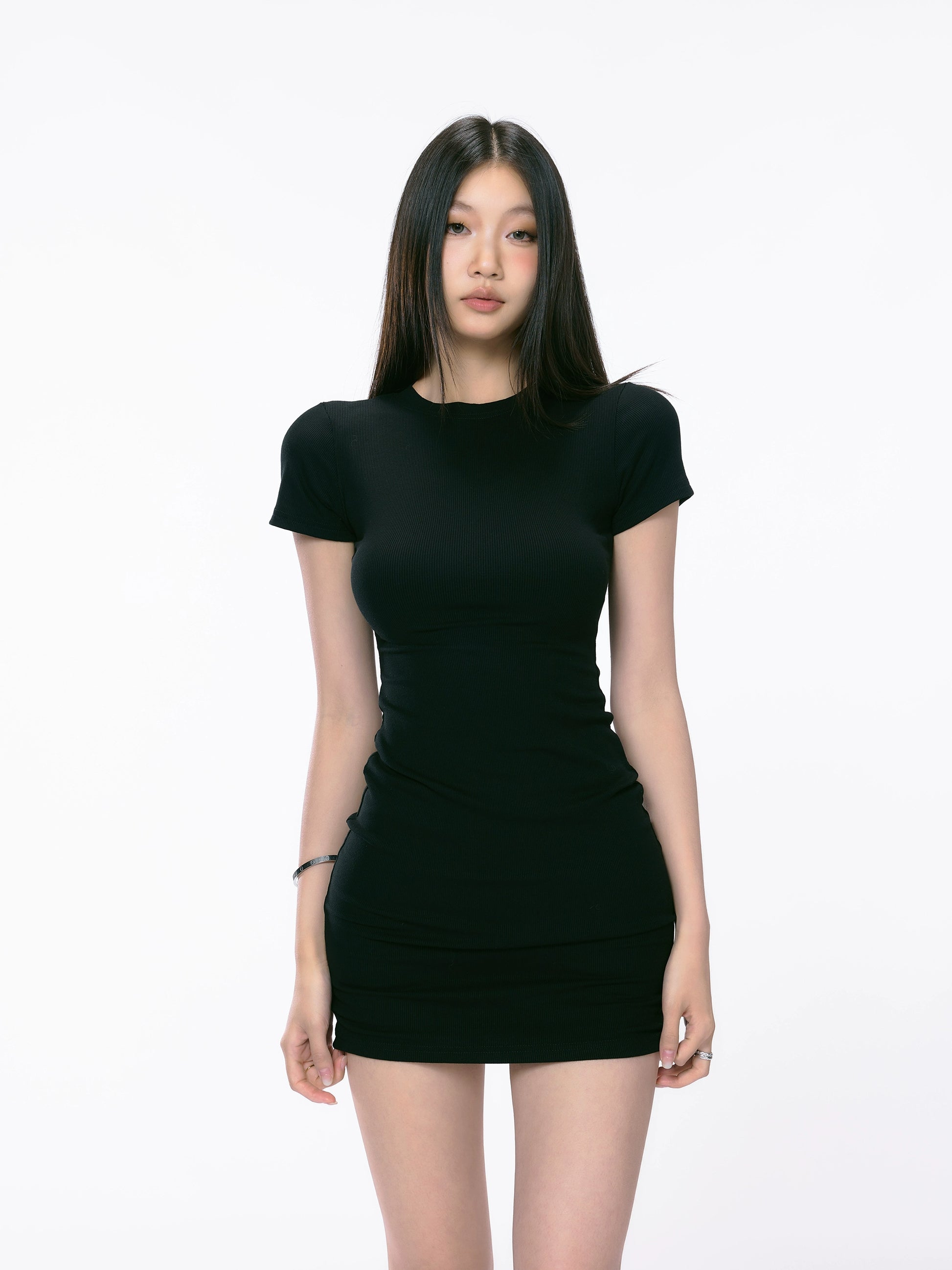 The Ariana Ribbed Mini Dress hugs the figure with a soft, stretchy knit that defines the silhouette. Its short sleeves and smooth texture make it an easy, minimal piece to dress up or down, perfect for both casual days and nights out.