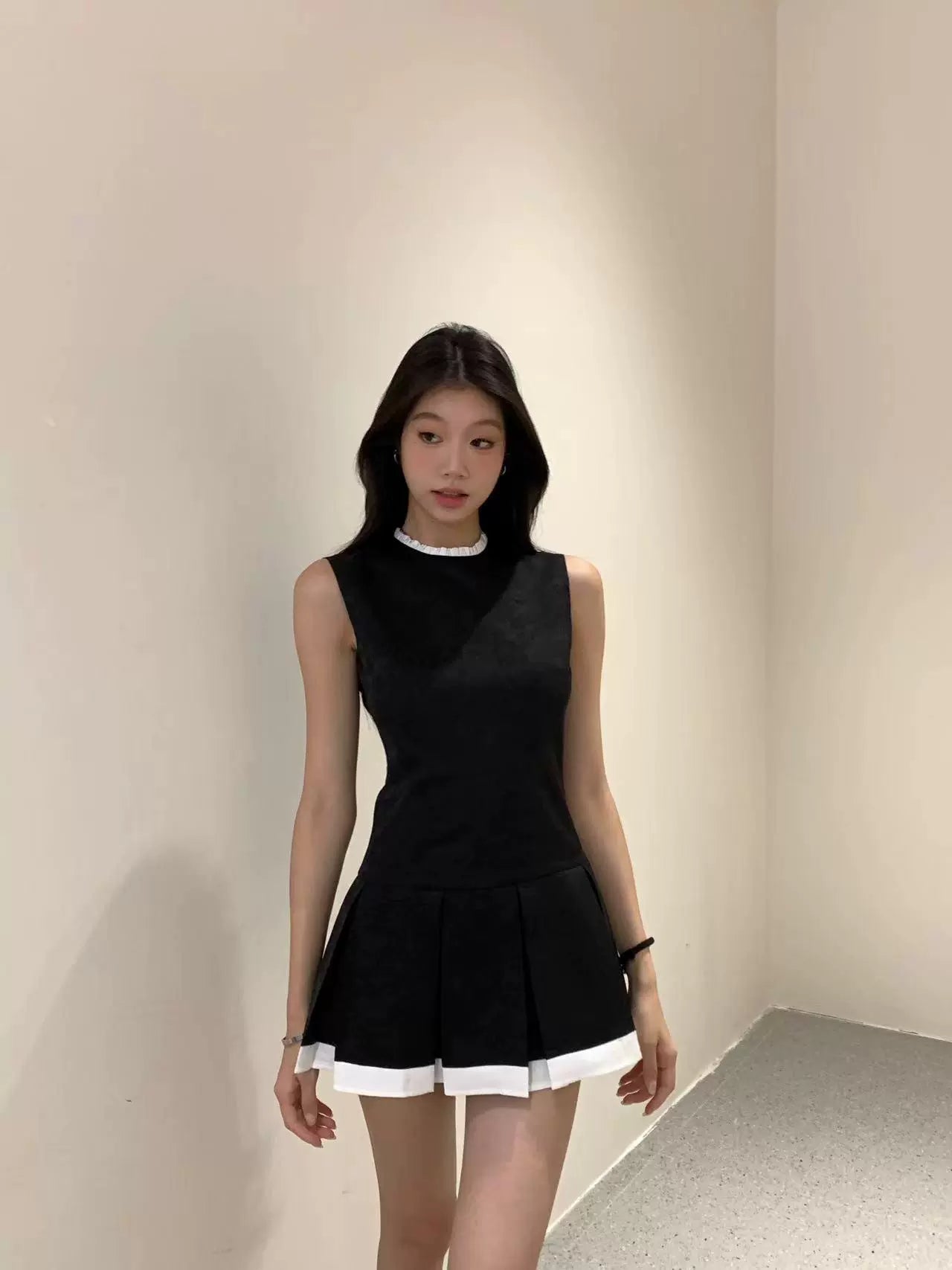 Clara is crisp, classic, and quietly bold. This sleeveless black dress features a fitted bodice with a scoop neckline, trimmed in white for a clean contrast. The pleated skirt adds soft movement, while the tailored waistline creates a flattering silhouette. Designed for ease and elegance, Clara pairs effortlessly with flats or boots for a refined everyday look.