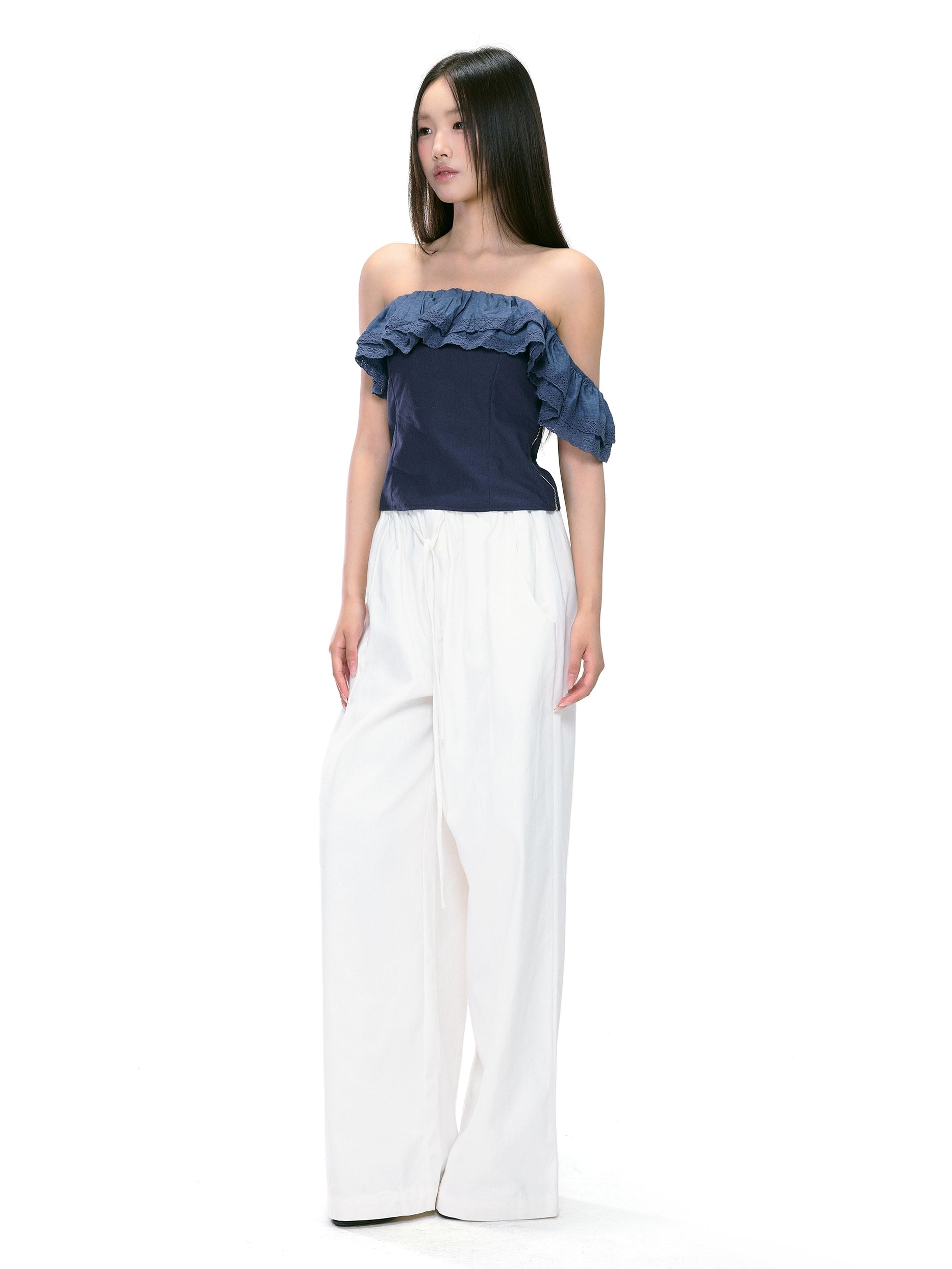 The Clara Ruffled Asymmetrical Denim Top is a statement piece that blends structure with femininity. Crafted from a soft yet durable cotton-blend fabric, it features an elegant off-shoulder neckline with layered ruffle details for a romantic, voluminous touch. The fitted bodice shapes the waist beautifully, while the denim-inspired texture adds a modern, elevated edge. Perfect to pair with white trousers or skirts for a clean and sophisticated contrast.