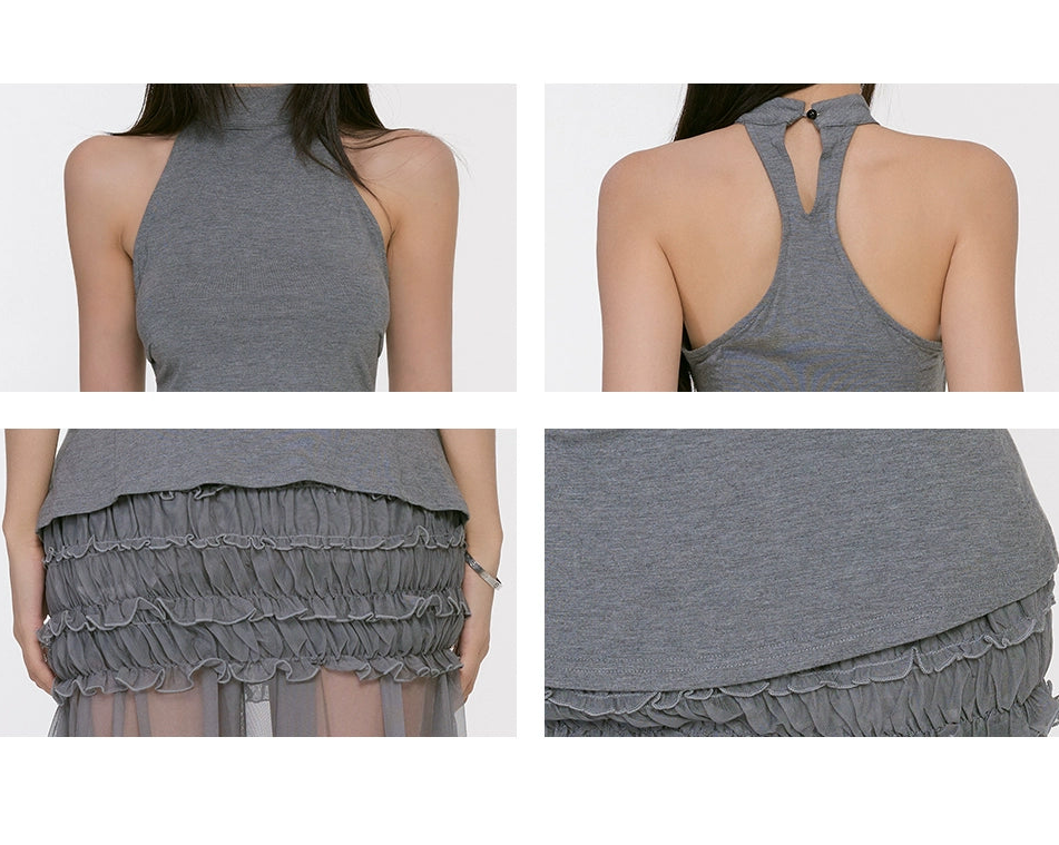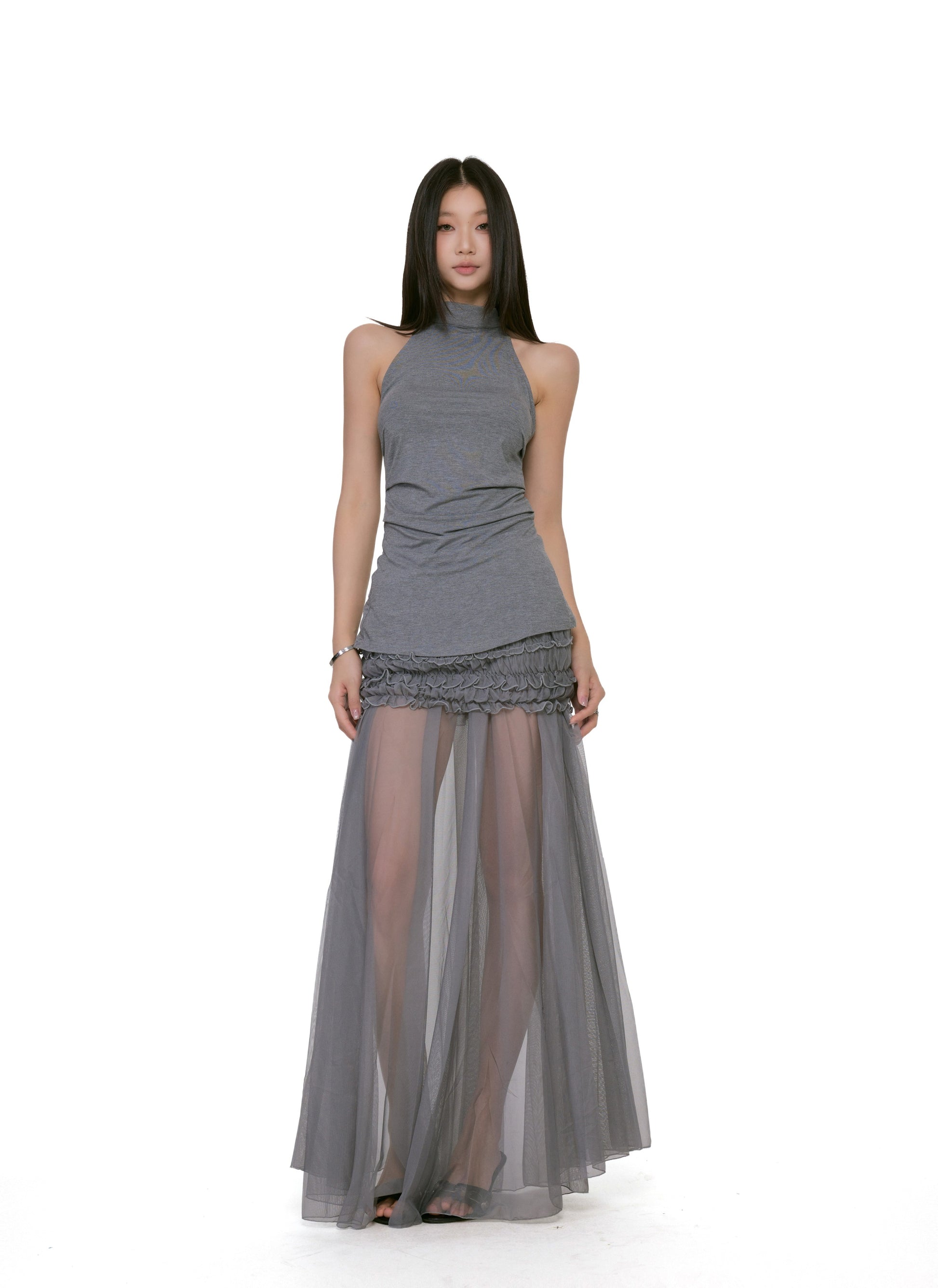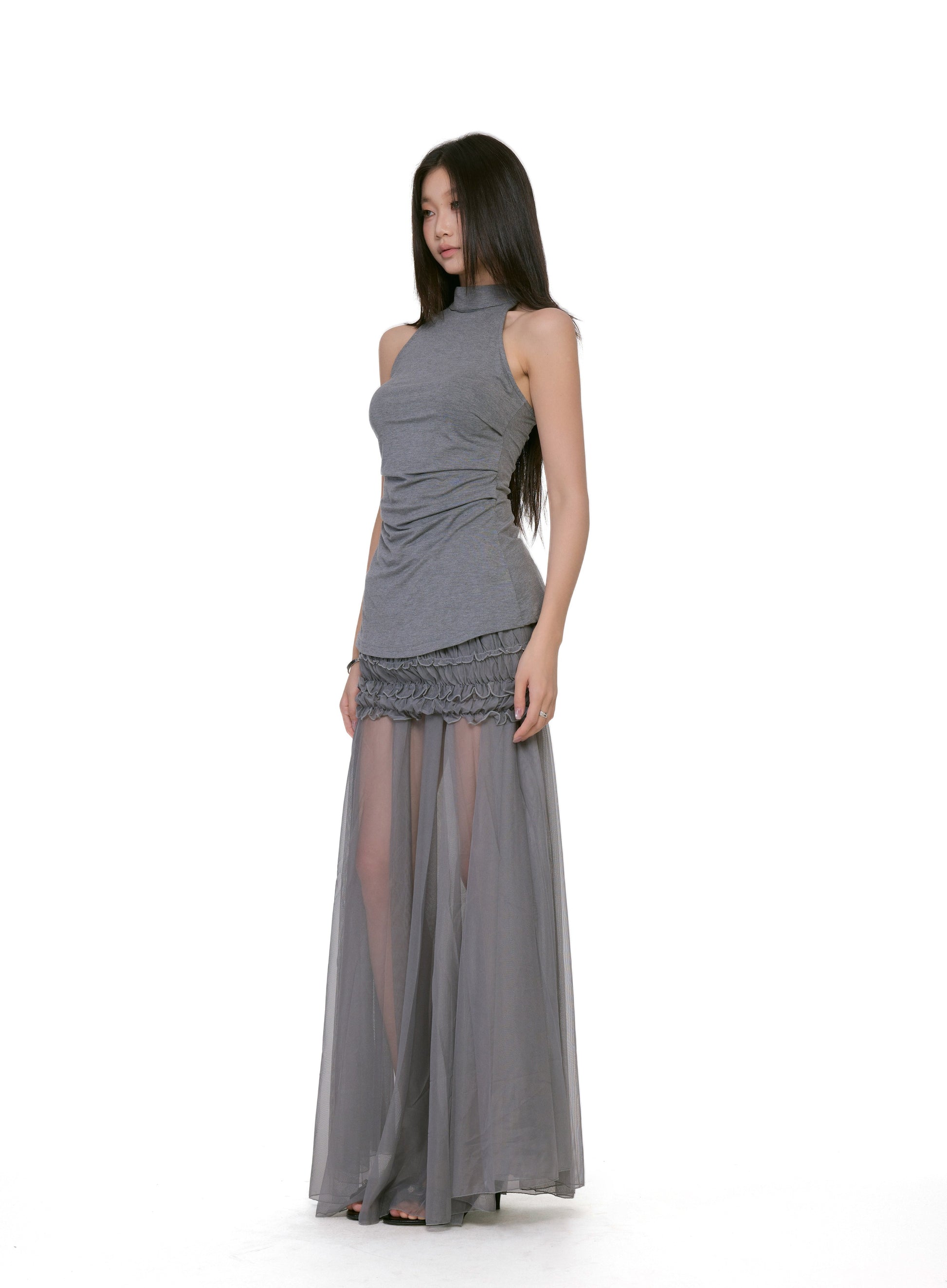 Elira is a quiet statement - softly sculpted, effortlessly graceful. This sleeveless maxi dress pairs a high neckline with a delicately ruched waist, creating a silhouette that feels both structured and fluid. The sheer layered skirt floats with every step, revealing just enough to evoke intrigue while maintaining elegance. Its muted gray tone and translucent texture lend a modern, ethereal mood, perfect for minimalists with a romantic edge. Whether styled for a gallery opening or a twilight dinner, Elira moves with quiet confidence.