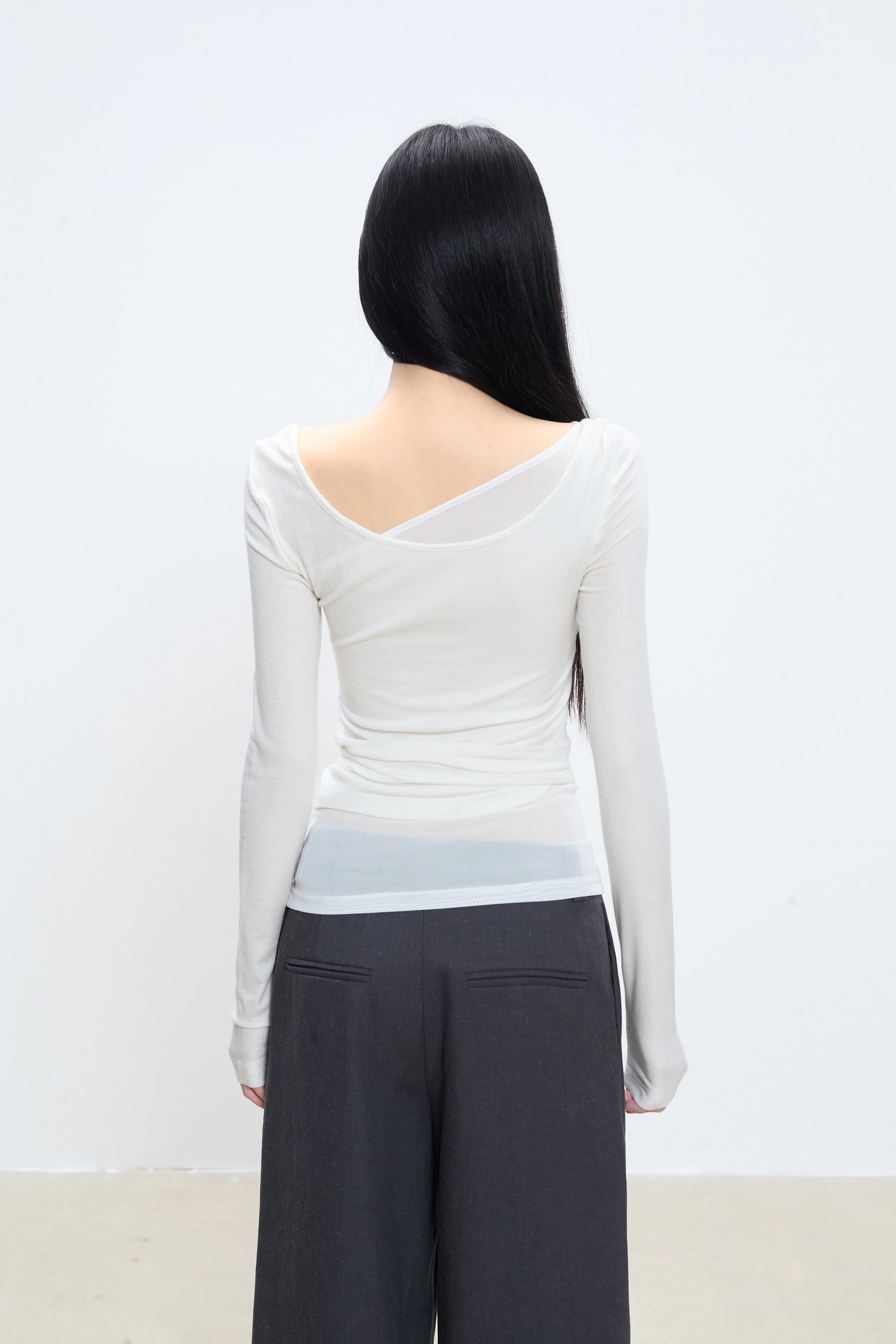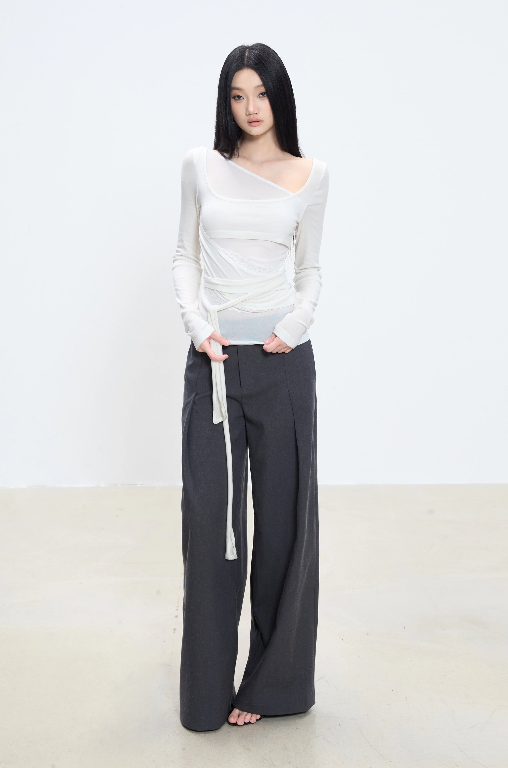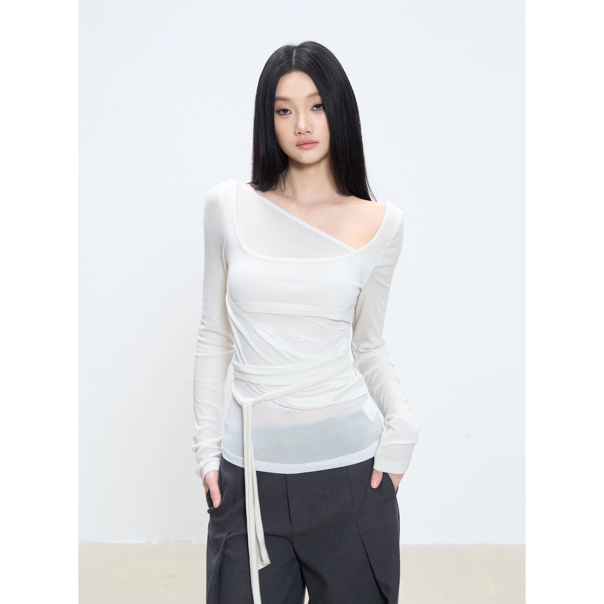 The Isola Asymmetrical Wrap Long Sleeve Top combines elegance with an artistic silhouette. Designed with a layered neckline and soft wrap detail tied at the waist, it sculpts the body with subtle transparency and delicate texture. The lightweight stretch fabric gently follows your shape while allowing movement and comfort. Perfect for pairing with tailored trousers or flowing skirts for a refined, modern look.