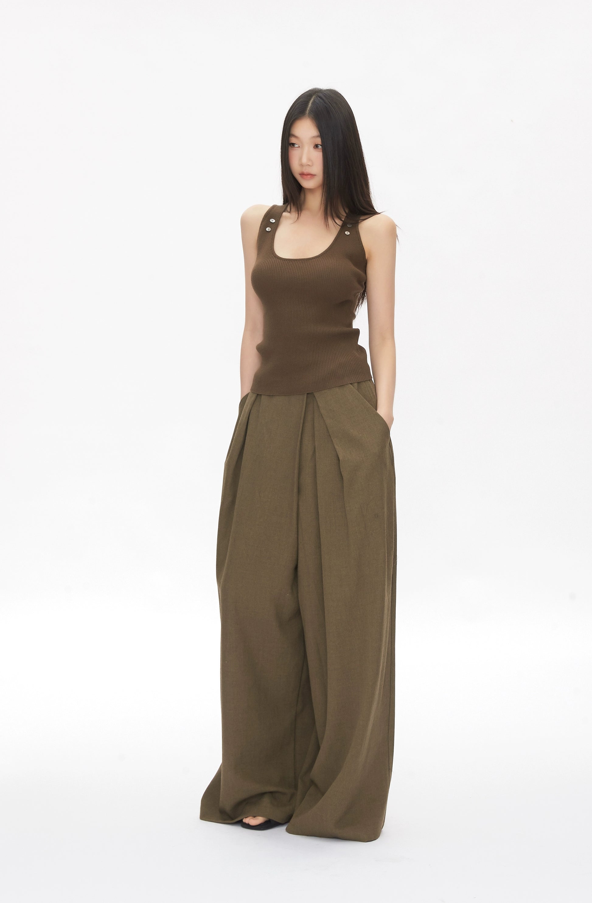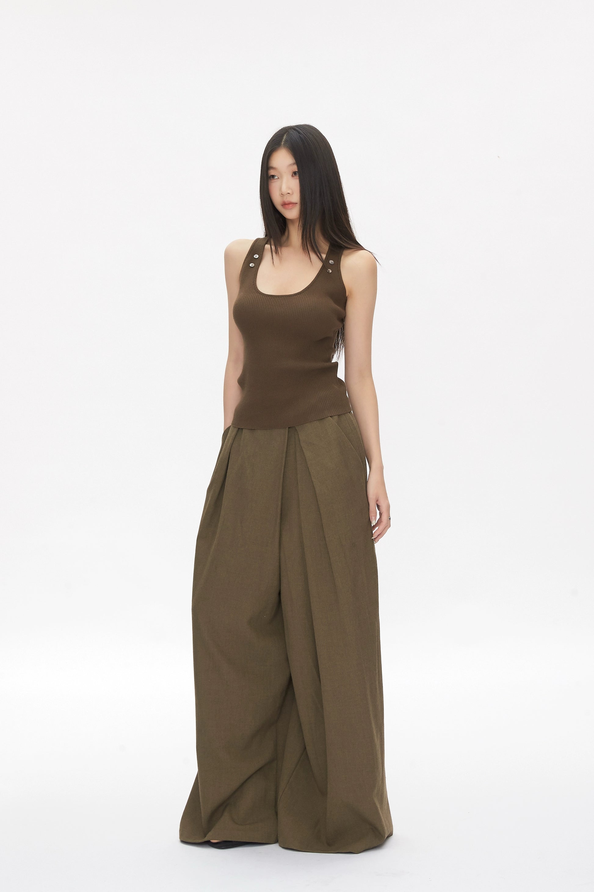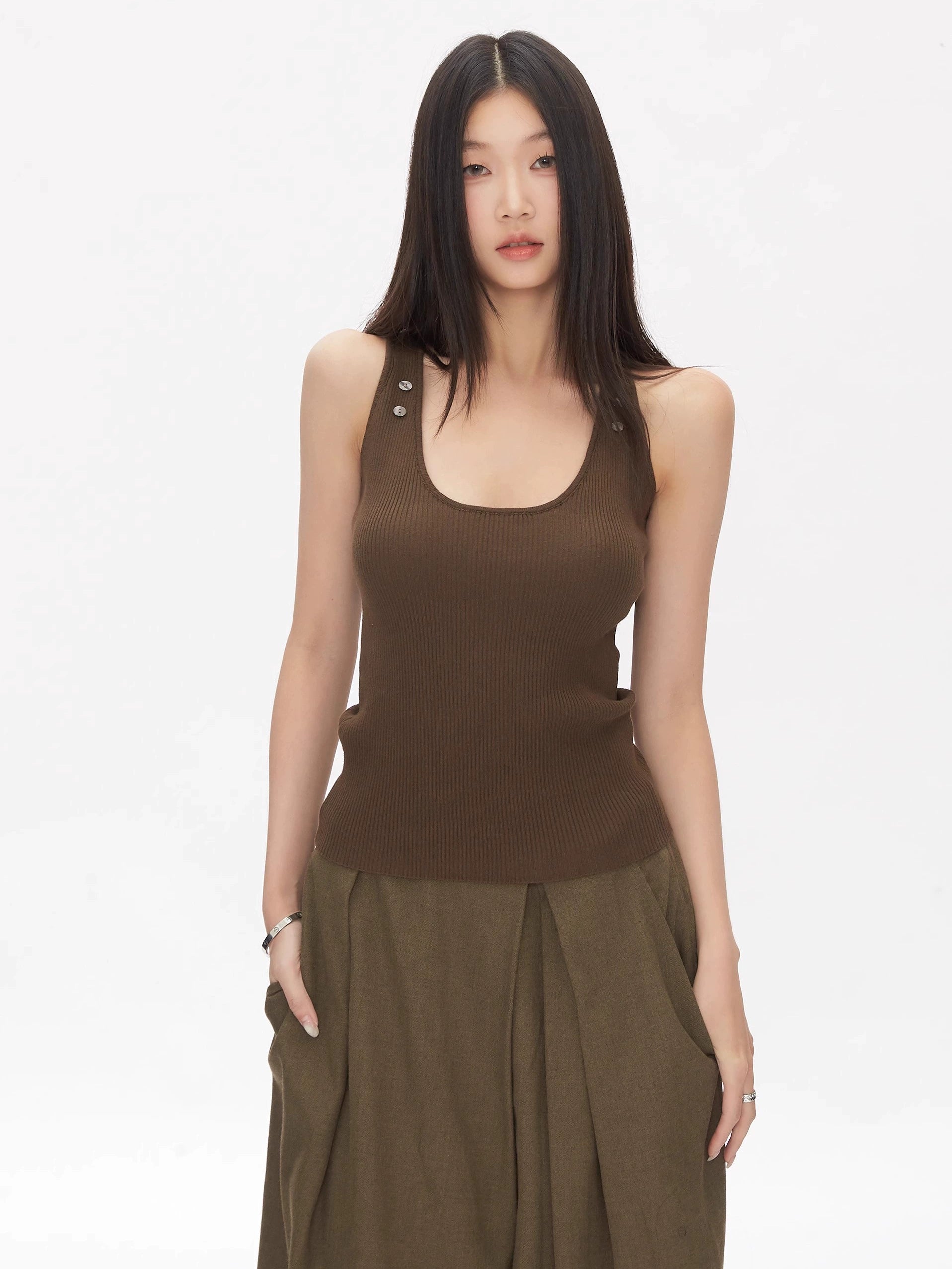 Kael is tactile clarity with a utilitarian twist. This sleeveless ribbed knit tank features a scoop neckline and tonal button detailing along the shoulder straps. The fitted silhouette hugs the body with soft stretch, while the textured brown fabric adds depth and warmth. Designed for layering or solo wear, Kael pairs effortlessly with skirts, trousers, or denim for clean, grounded styling.