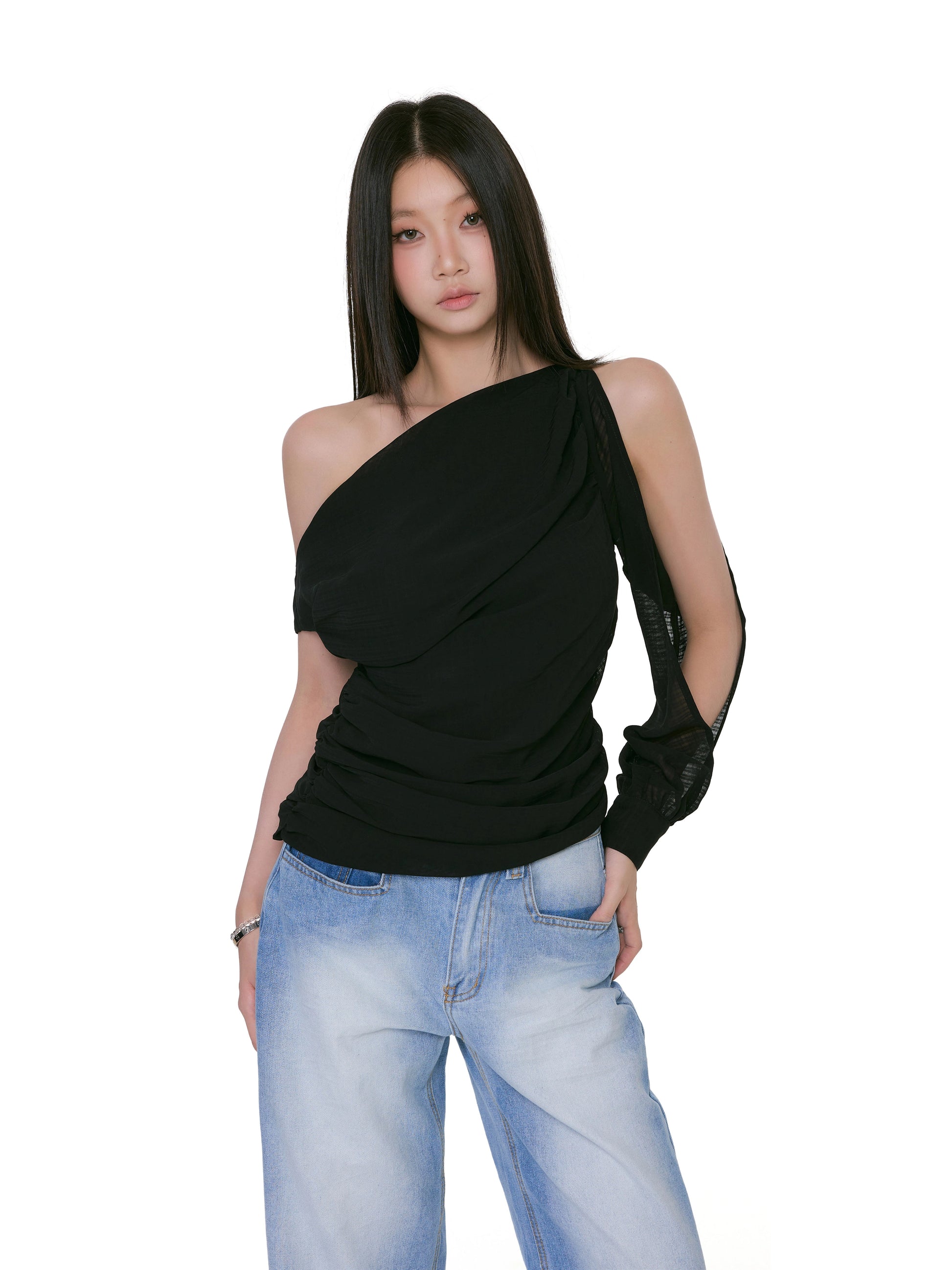 The Kaia Asymmetrical One-Shoulder Top combines bold design with refined minimalism. Featuring a single long sleeve with a cutout detail and a draped neckline that flatters your frame, this top exudes modern elegance. The soft, structured fabric enhances the silhouette while ensuring comfort and style. Pair it with denim or tailored trousers for an effortlessly elevated look.