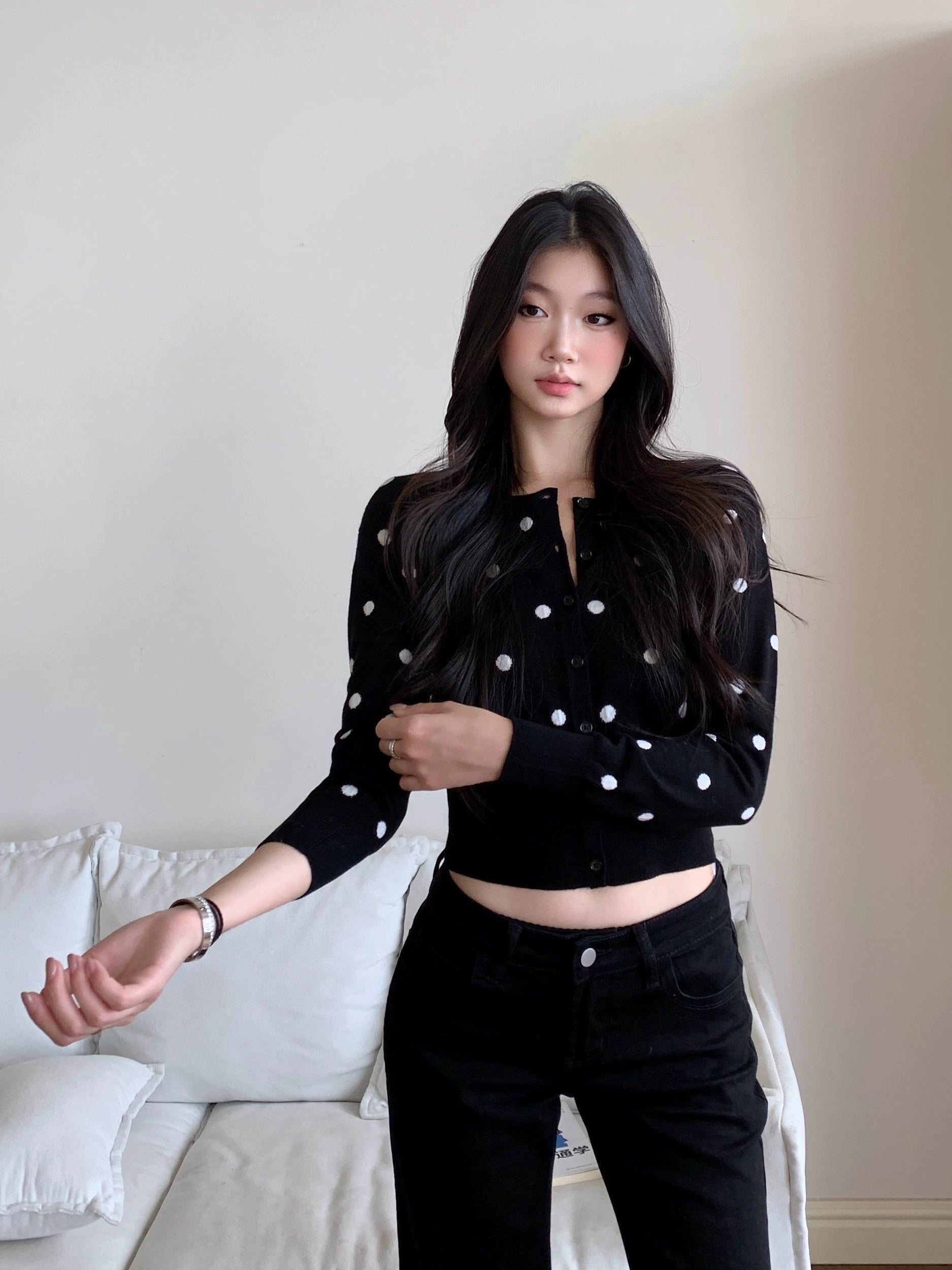 Maelle brings playful charm to a classic silhouette. This cropped cardigan features a soft knit texture with crisp white polka dots scattered across a deep black base. The button-up front and long sleeves offer structure, while the slightly fitted cut flatters the waistline with ease. It’s a piece that feels both retro and modern, perfect for adding a touch of whimsy to monochrome looks or layering over sleek basics. Wear it when you want to feel effortlessly put together with a hint of fun.
