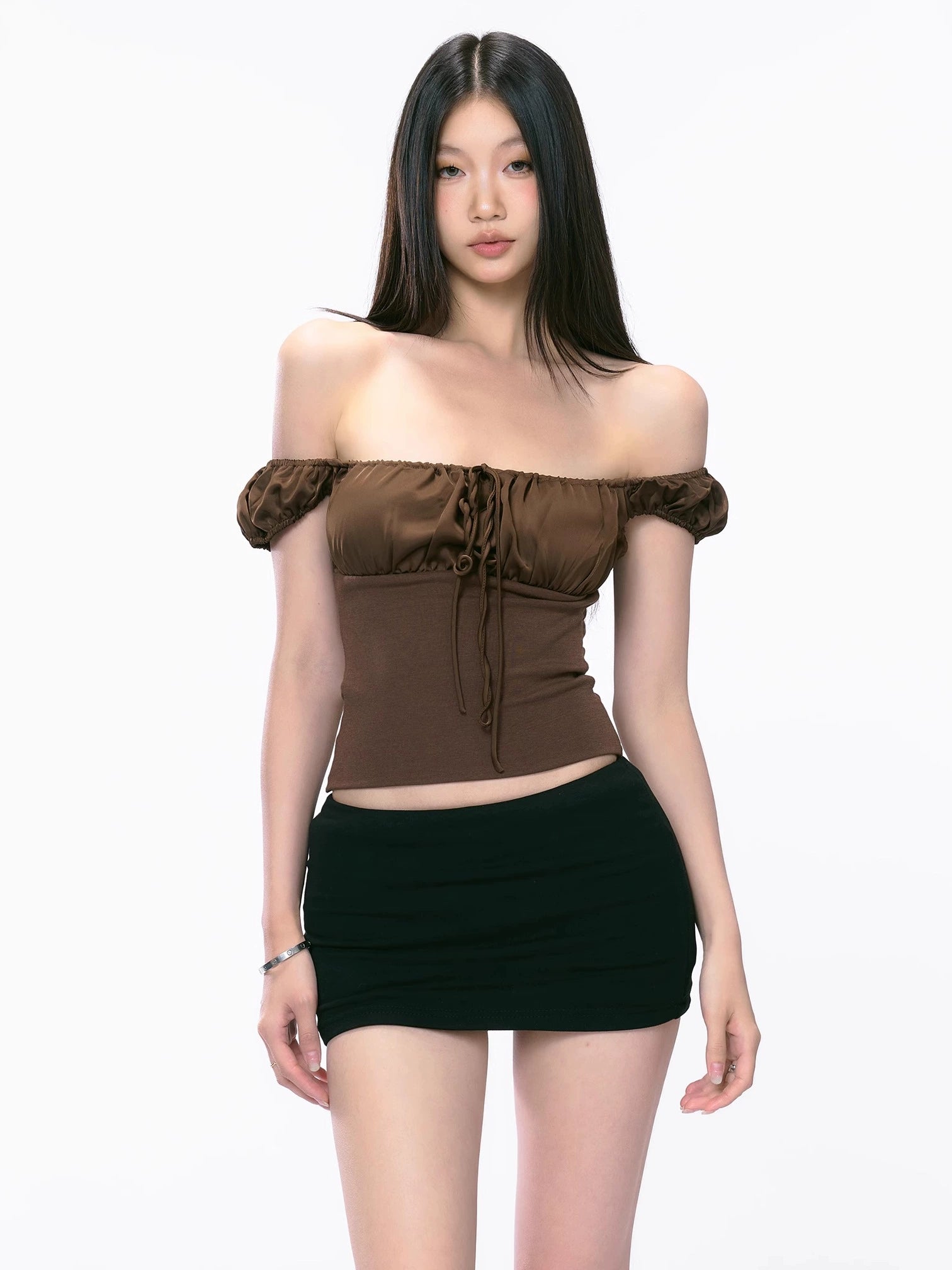 Mira blends softness with playful structure. Designed with an off-shoulder neckline and puffed sleeves, it frames the collarbone beautifully while adding volume and charm. The front drawstring detail allows for adjustable ruching, creating a flattering fit that highlights the waist. Crafted in a warm brown tone, Mira pairs effortlessly with skirts or trousers for a romantic yet modern look.