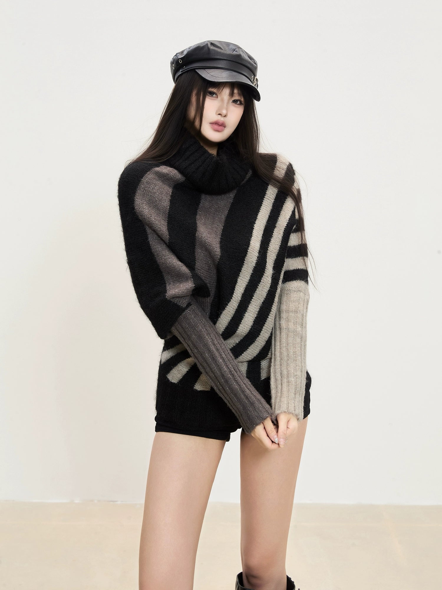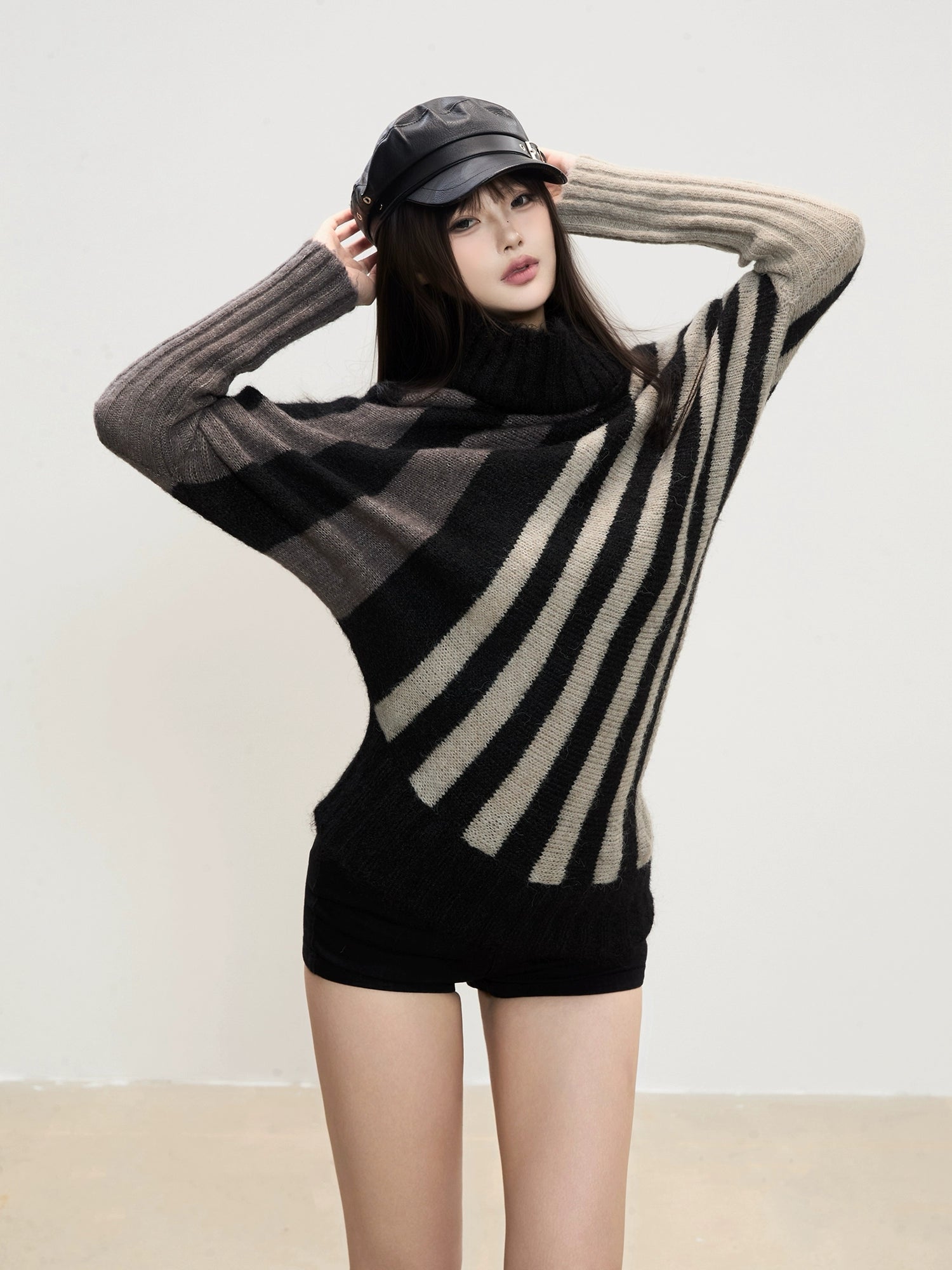 The Mira Striped Turtleneck Knit Sweater combines warmth with statement style. Its bold diagonal stripes and mixed-tone sleeves give it a modern edge, while the loose fit and soft knit provide comfort and movement. Perfect for layering or pairing with fitted bottoms for a balanced look.