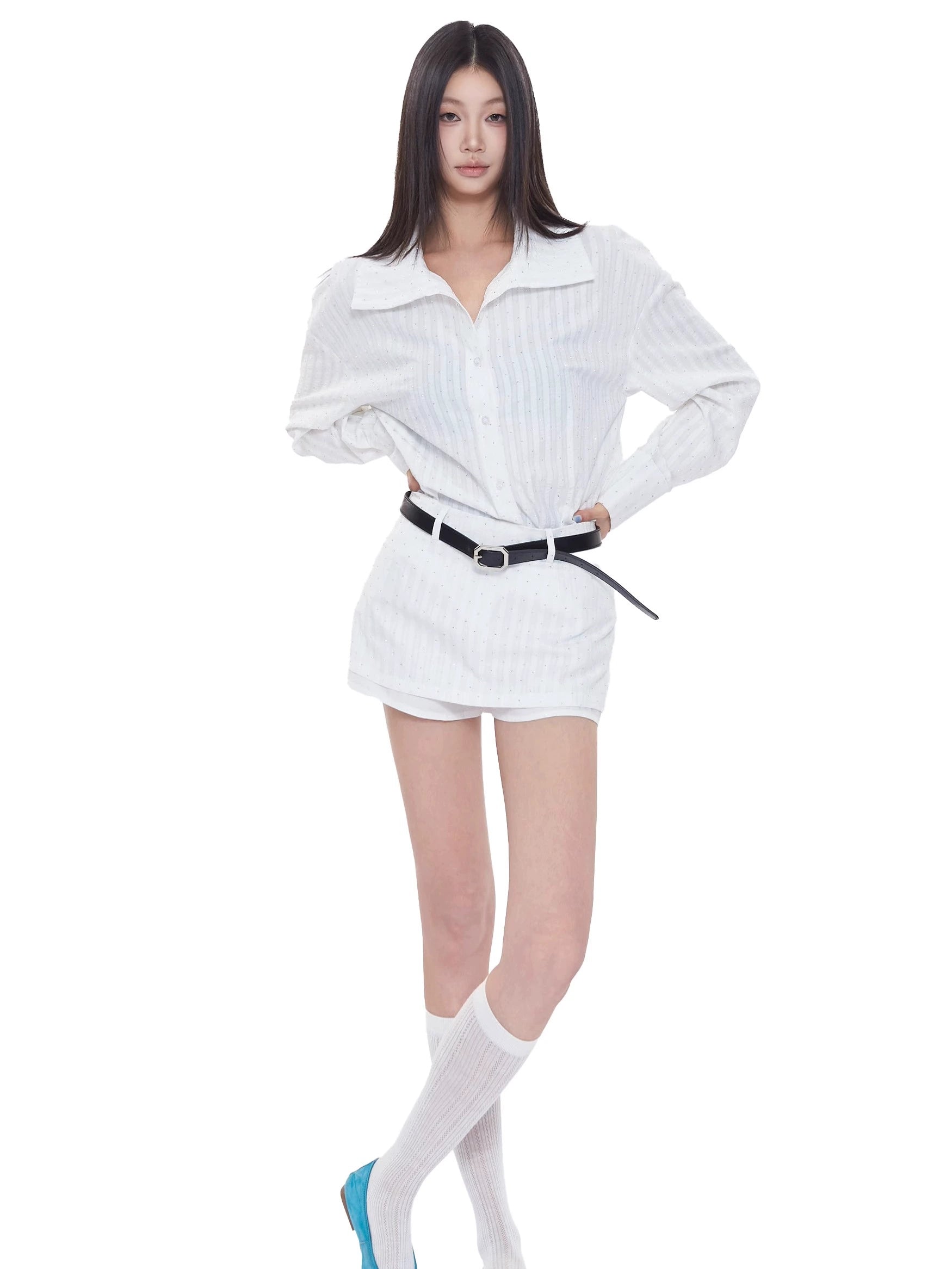 The Sera Classic Striped Shirt & Mini Skirt Set brings effortless sophistication with a modern twist. The lightweight shirt features subtle vertical stripes, a wide collar, and relaxed sleeves for a soft, tailored look. Paired with a matching high-waisted mini skirt, the ensemble captures a minimalist yet chic aesthetic perfect for both casual outings and refined evenings. Wear it together for a coordinated statement or mix and match with other wardrobe staples.