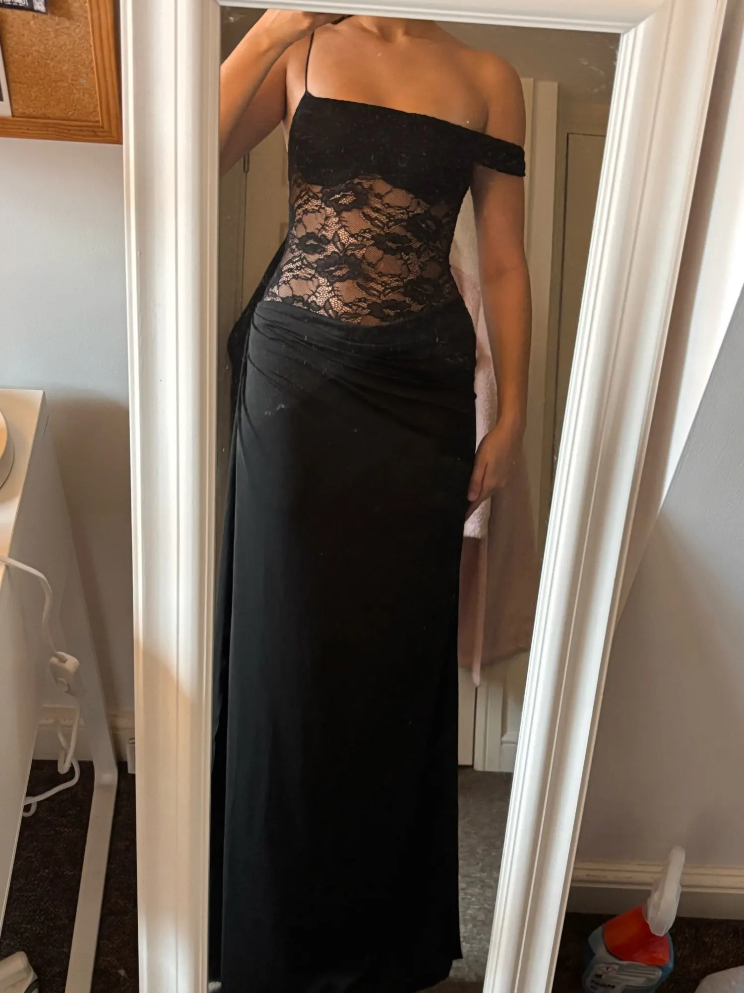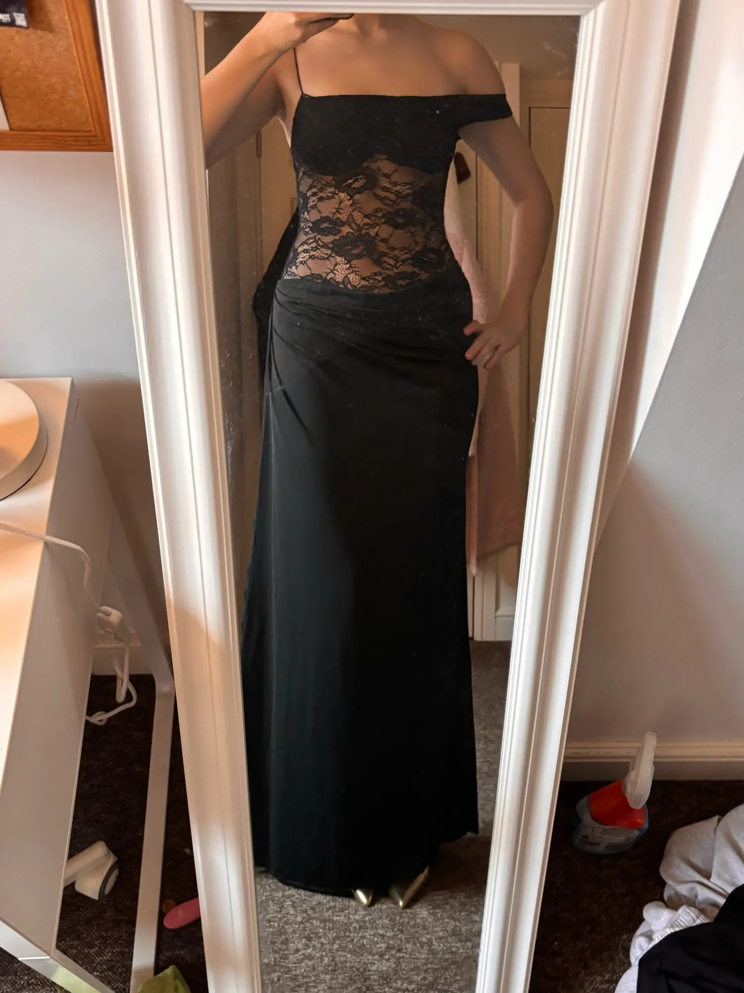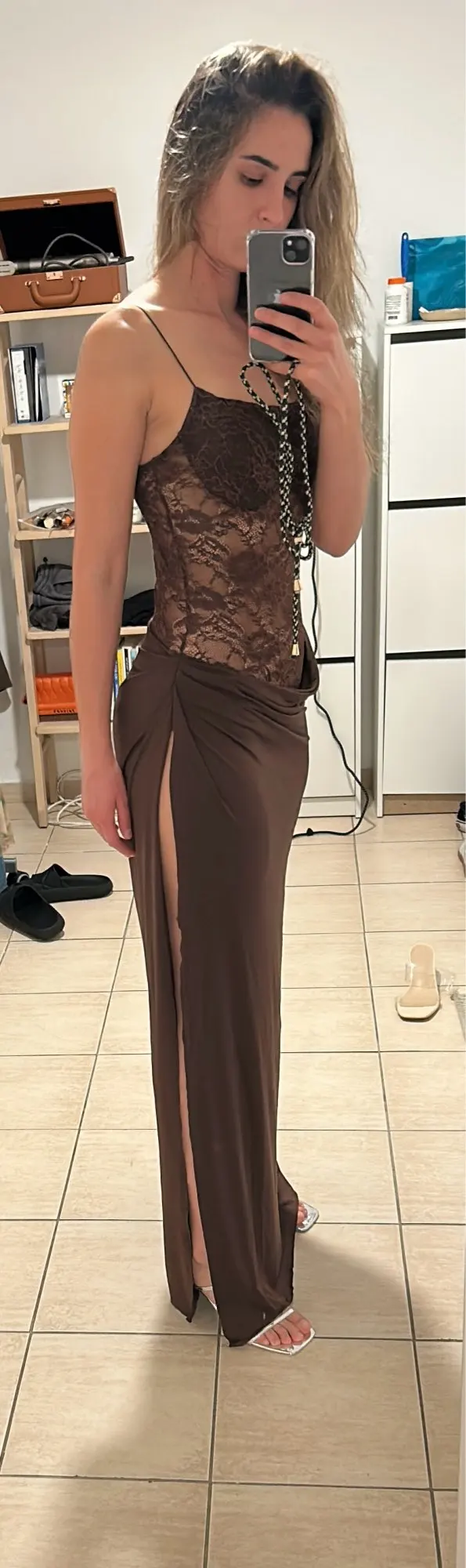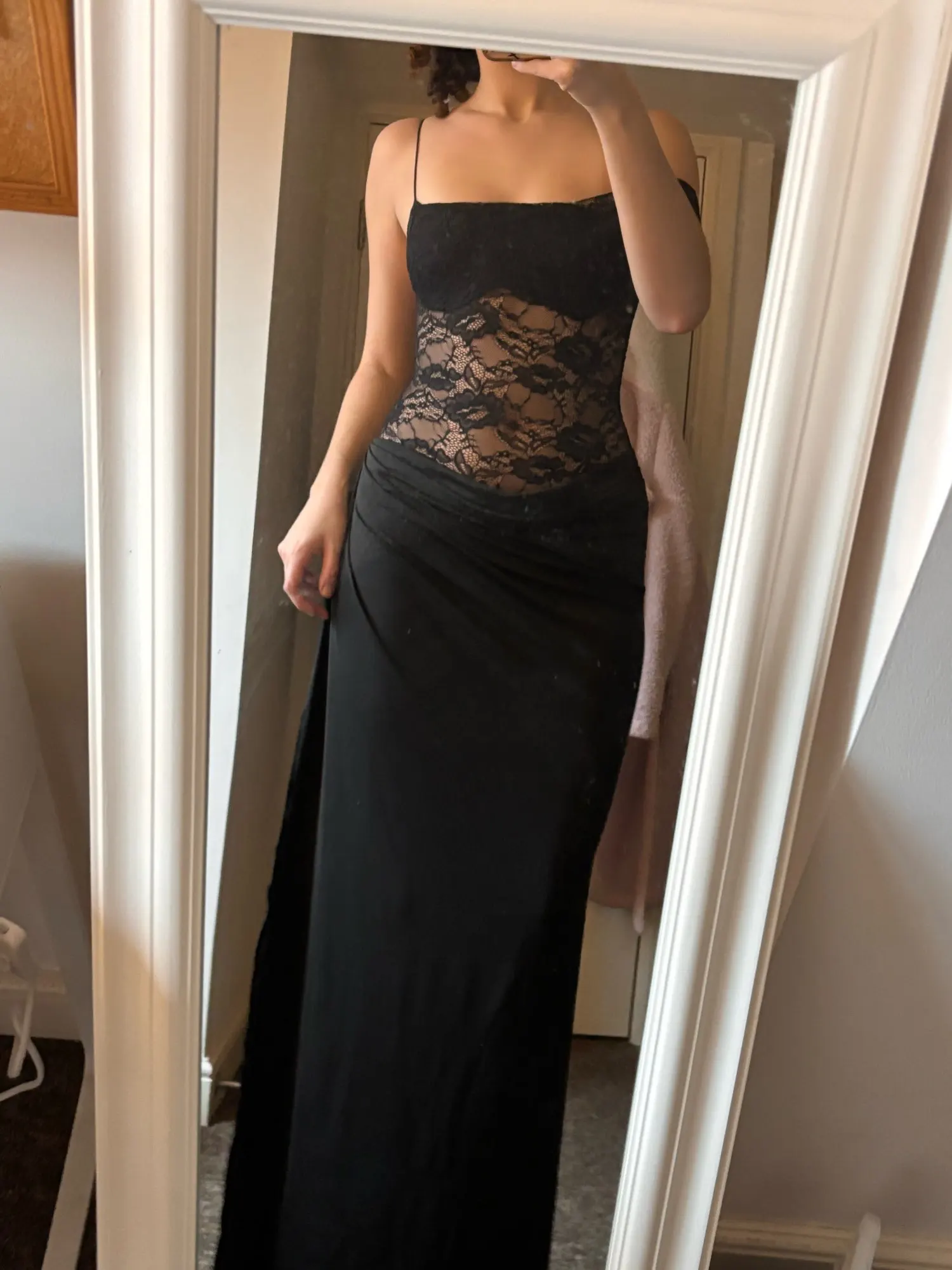 This dress is unreallll i got a size small i’m a uk 8 normally and about 5”7/8 but have heels on in the pics. Doesn’t feel like that cheap swimsuit material it’s really flattering. Slit is very high but can be easily pinned. The lace bit is a bodysuit with clips so feels very secure!