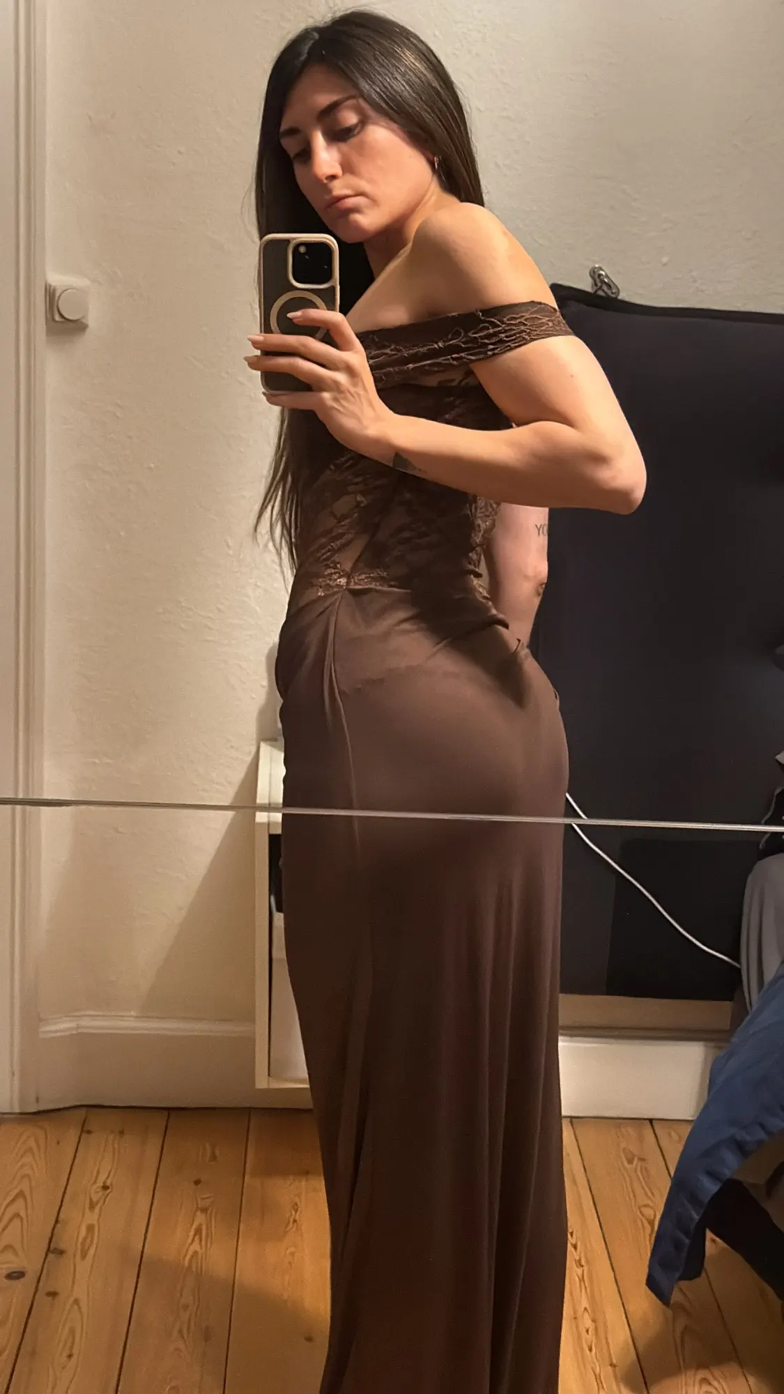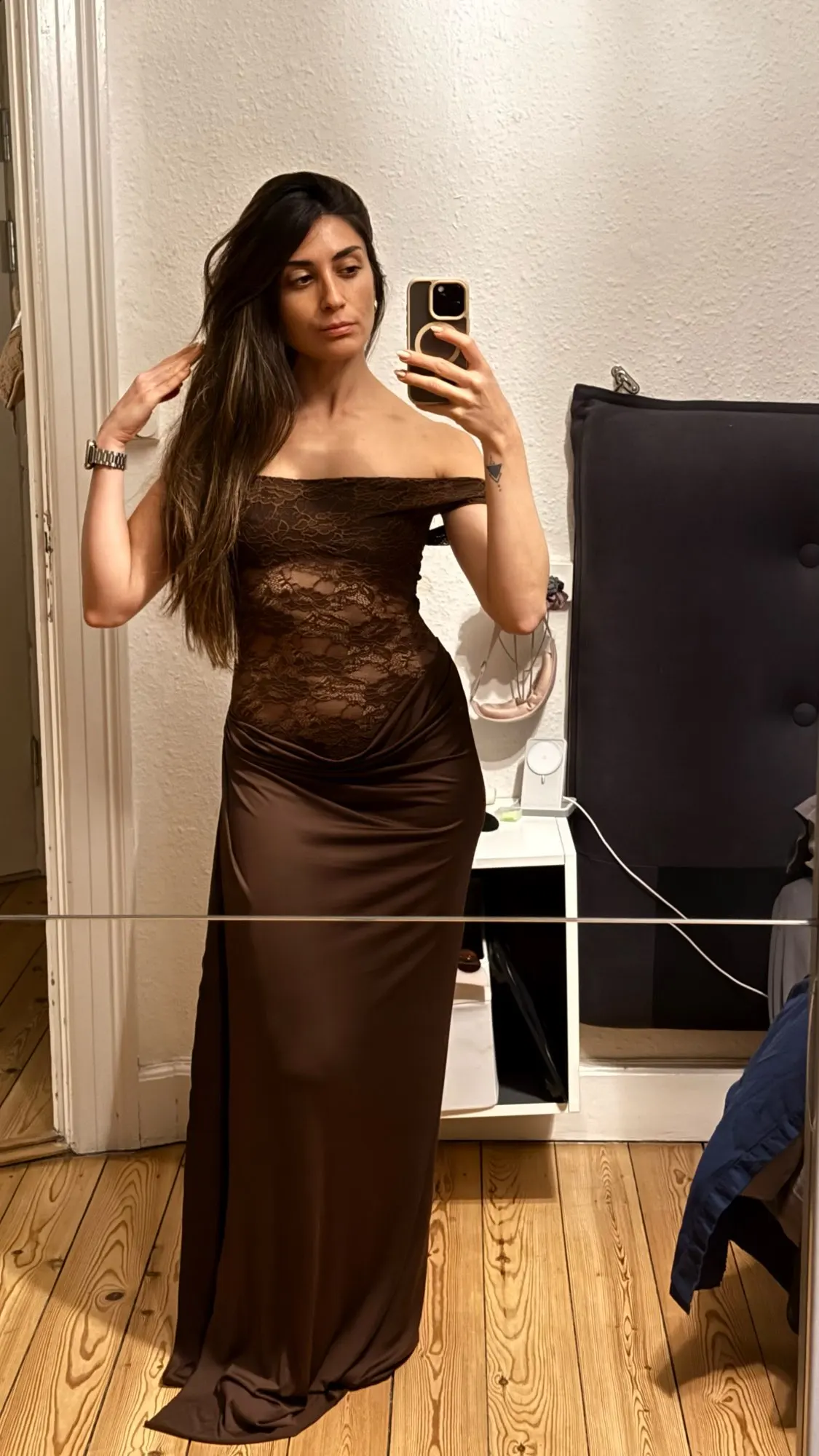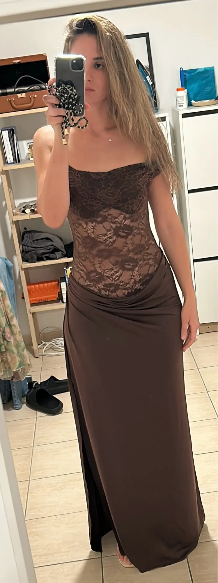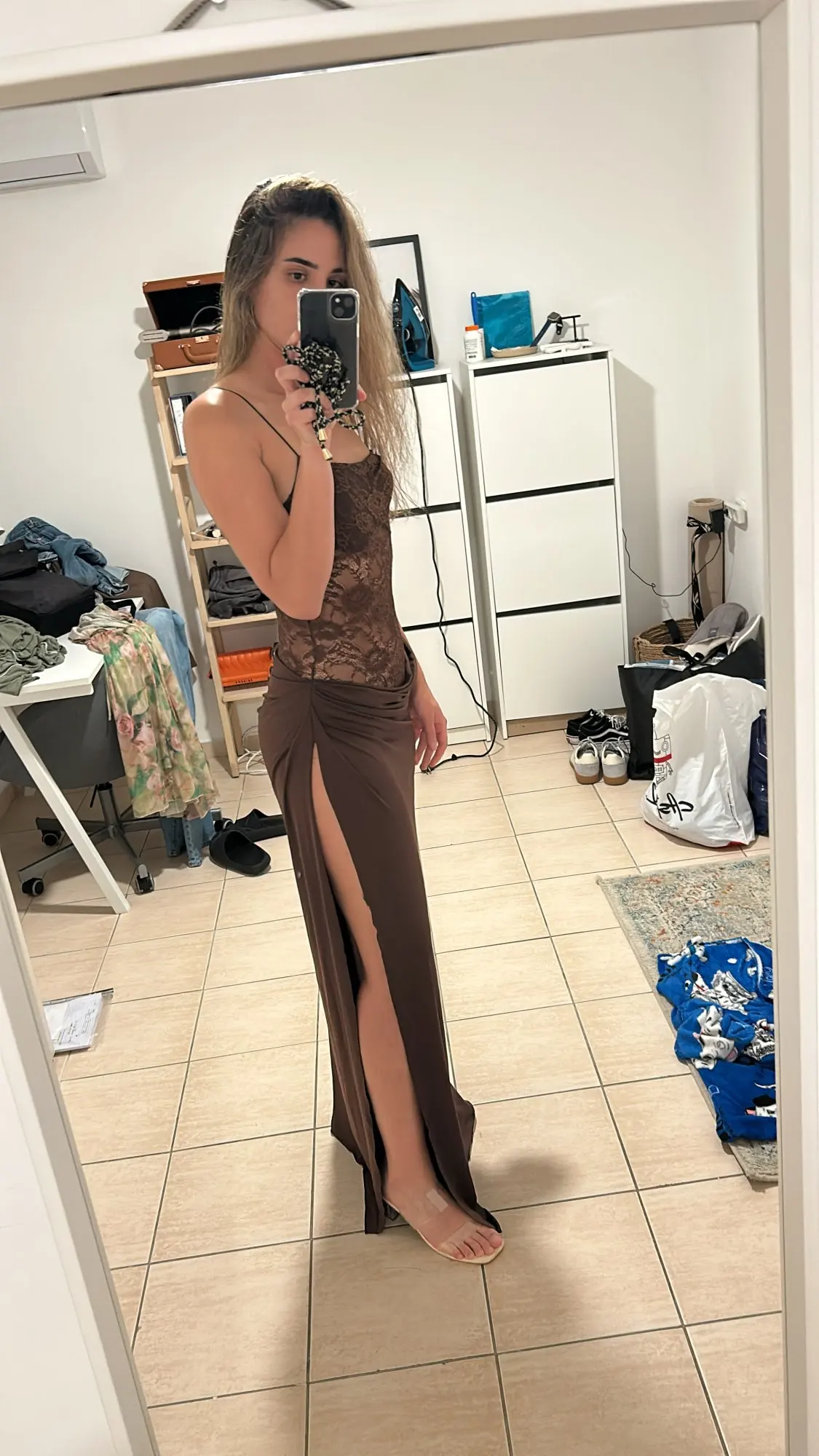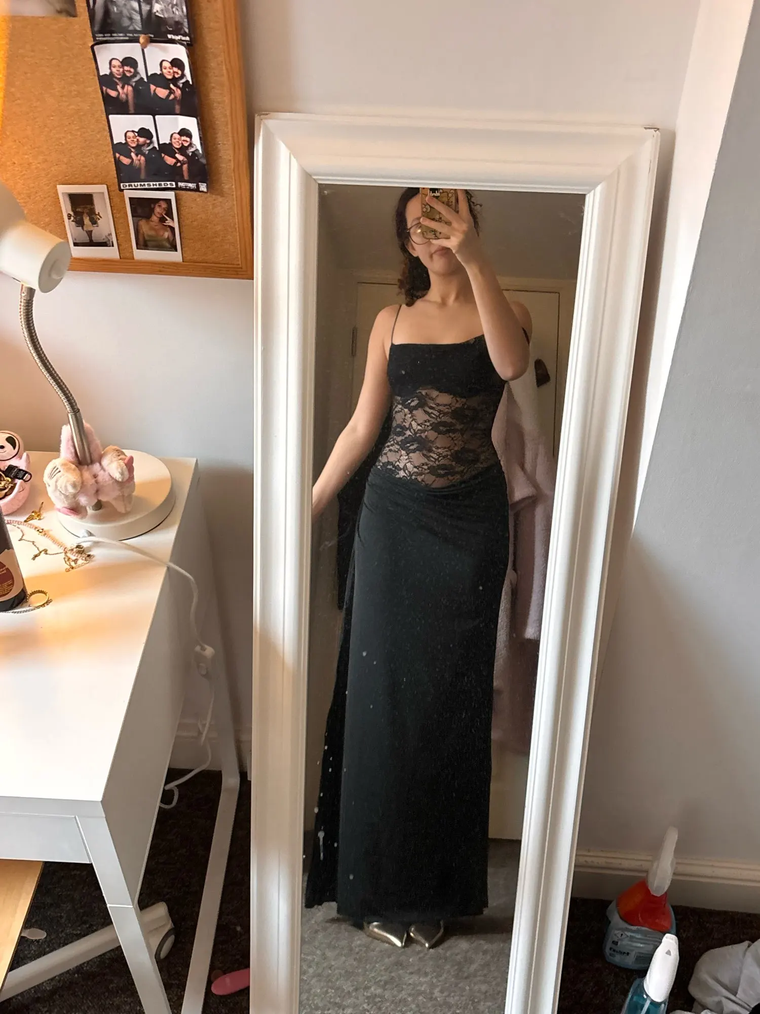 This dress is unreallll i got a size small i’m a uk 8 normally and about 5”7/8 but have heels on in the pics. Doesn’t feel like that cheap swimsuit material it’s really flattering. Slit is very high but can be easily pinned. The lace bit is a bodysuit with clips so feels very secure!