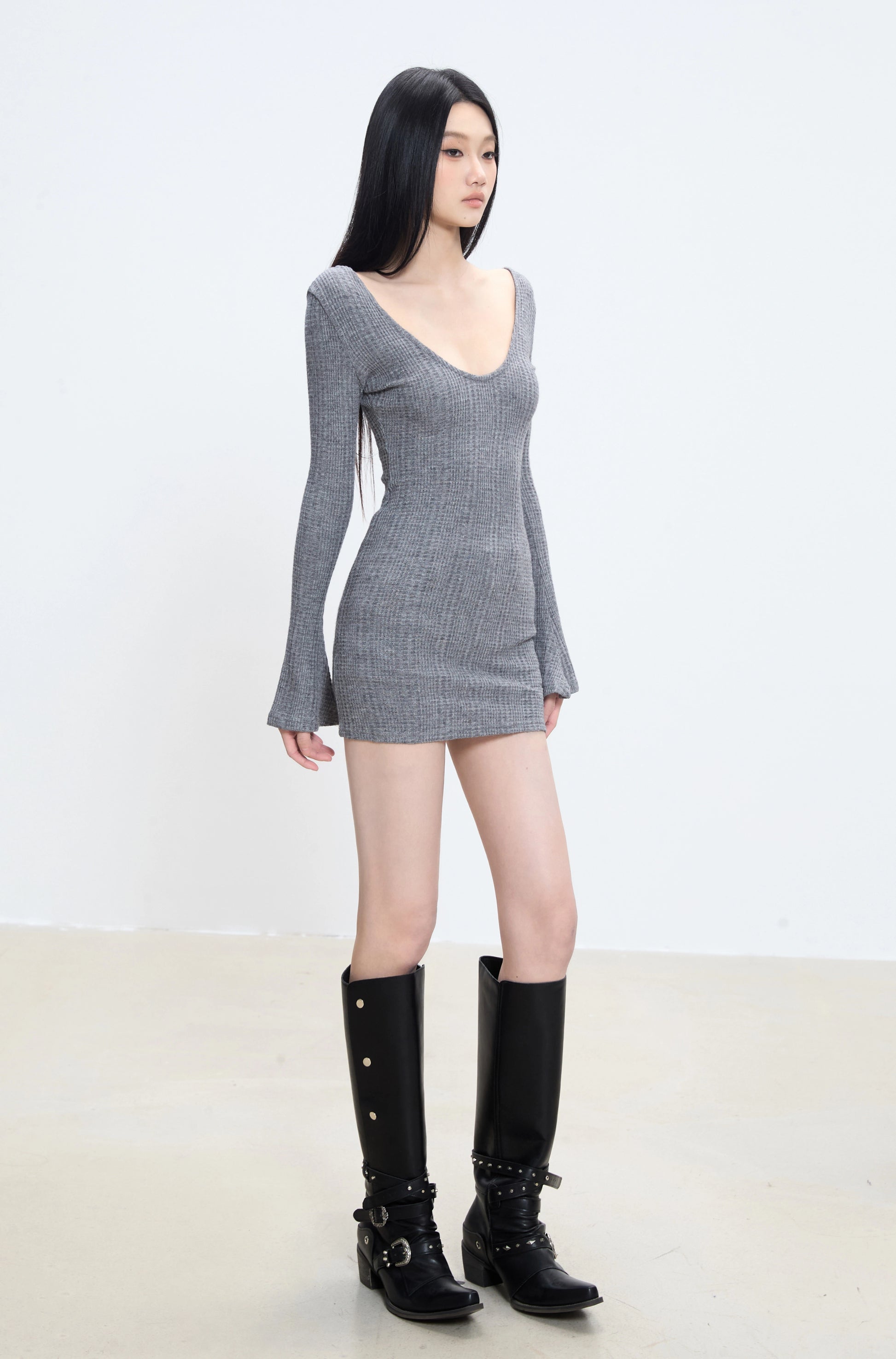 Tess is sculpted softness with a modern edge. This long-sleeved ribbed knit dress features a wide scoop neckline and flared cuffs, extending into a fitted bodice that flows into a skirt-like hem. The textured gray fabric hugs the body with stretch and structure, while the layered silhouette adds movement and clarity. Designed for minimalist styling with a touch of drama, Tess pairs effortlessly with boots or heels for transitional dressing.