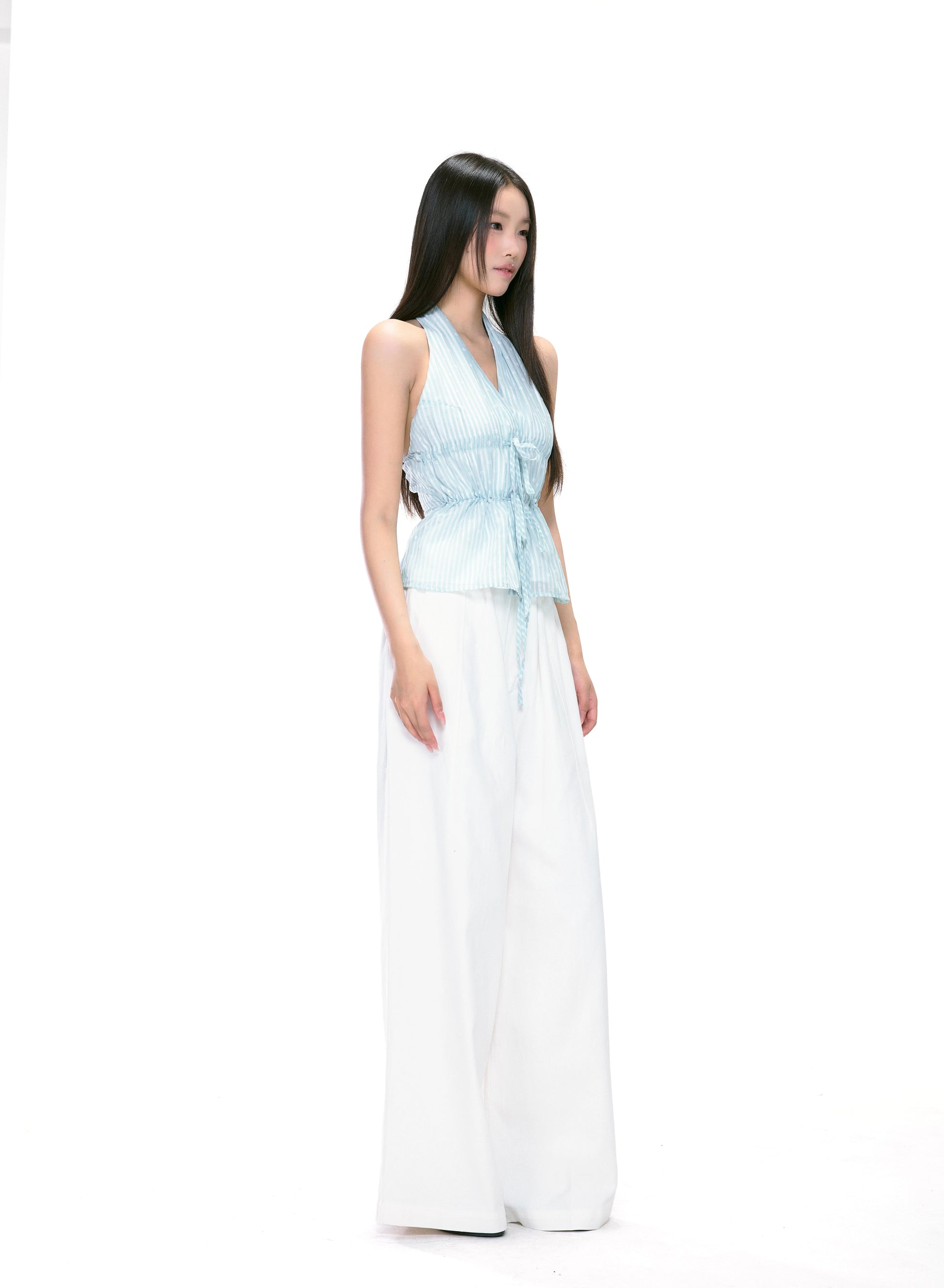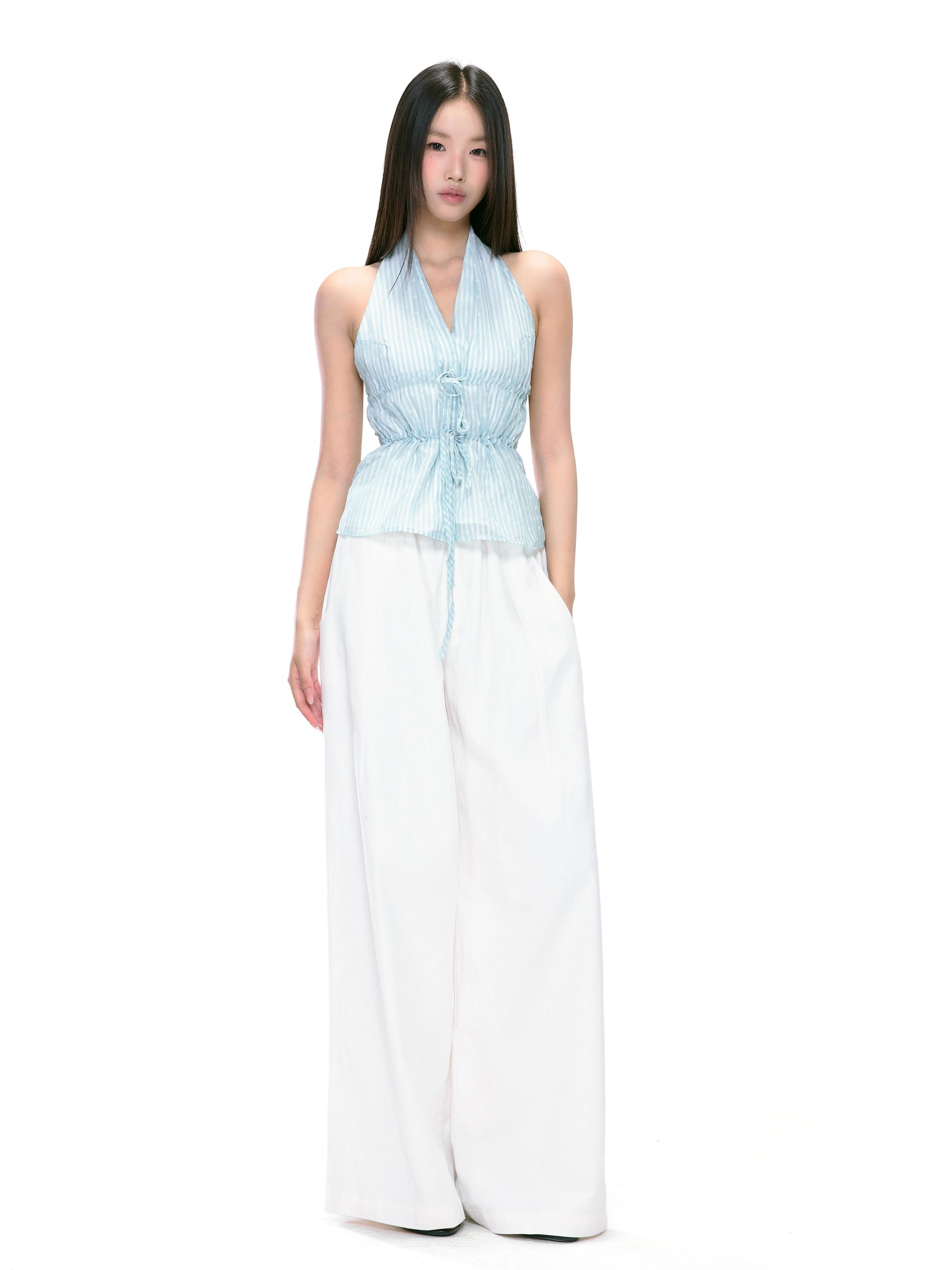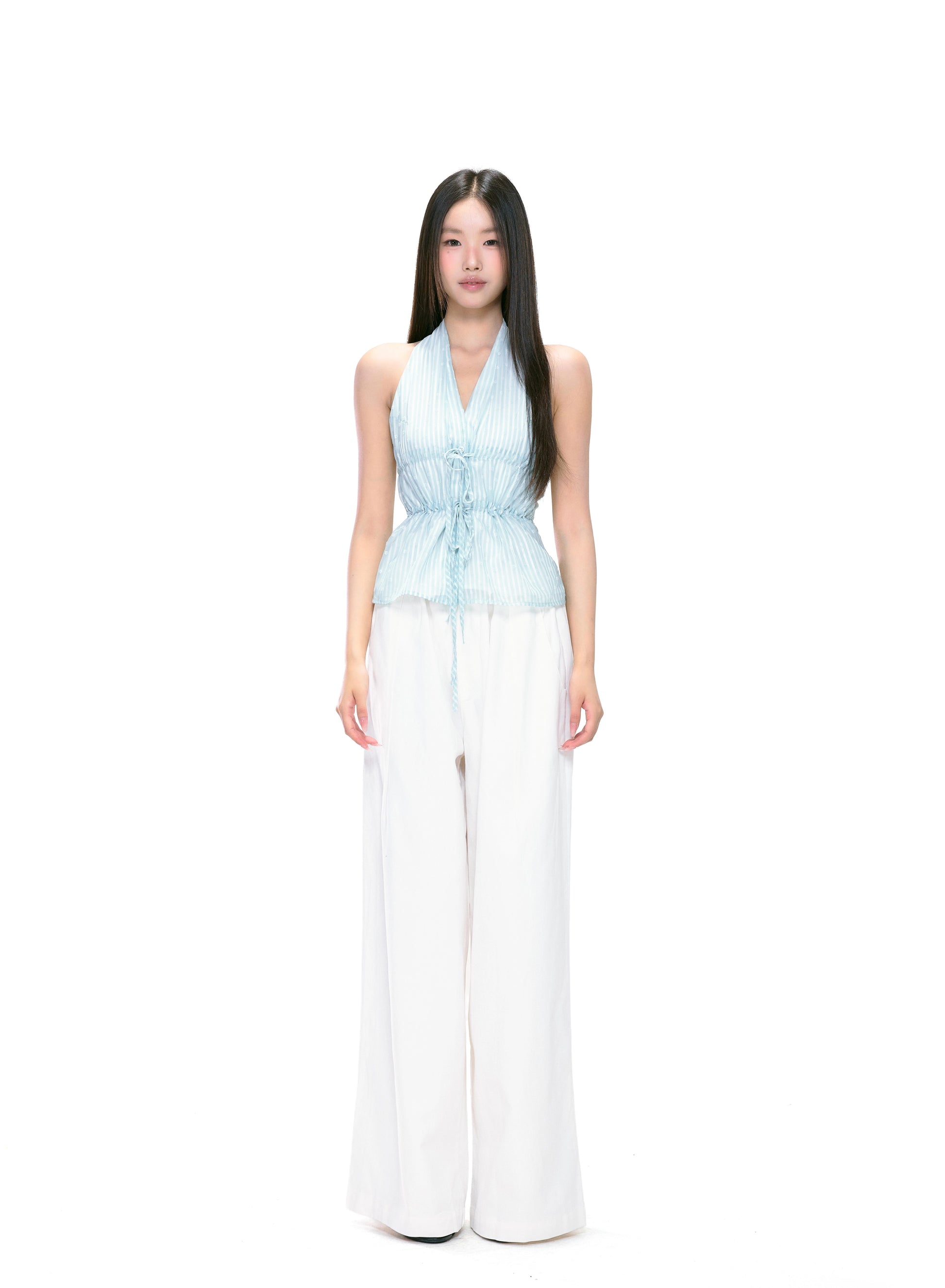 The Isla Striped Tie Halter Top captures a soft, feminine aesthetic with its airy, lightweight texture and cinched waist silhouette. Featuring subtle vertical stripes and delicate front ties, it adds structure while maintaining a relaxed, romantic flow. The open back halter neckline highlights the shoulders beautifully, making it a perfect piece for sunny days or layered looks. The smooth, semi-sheer fabric blend drapes gently against the skin, offering both comfort and charm.